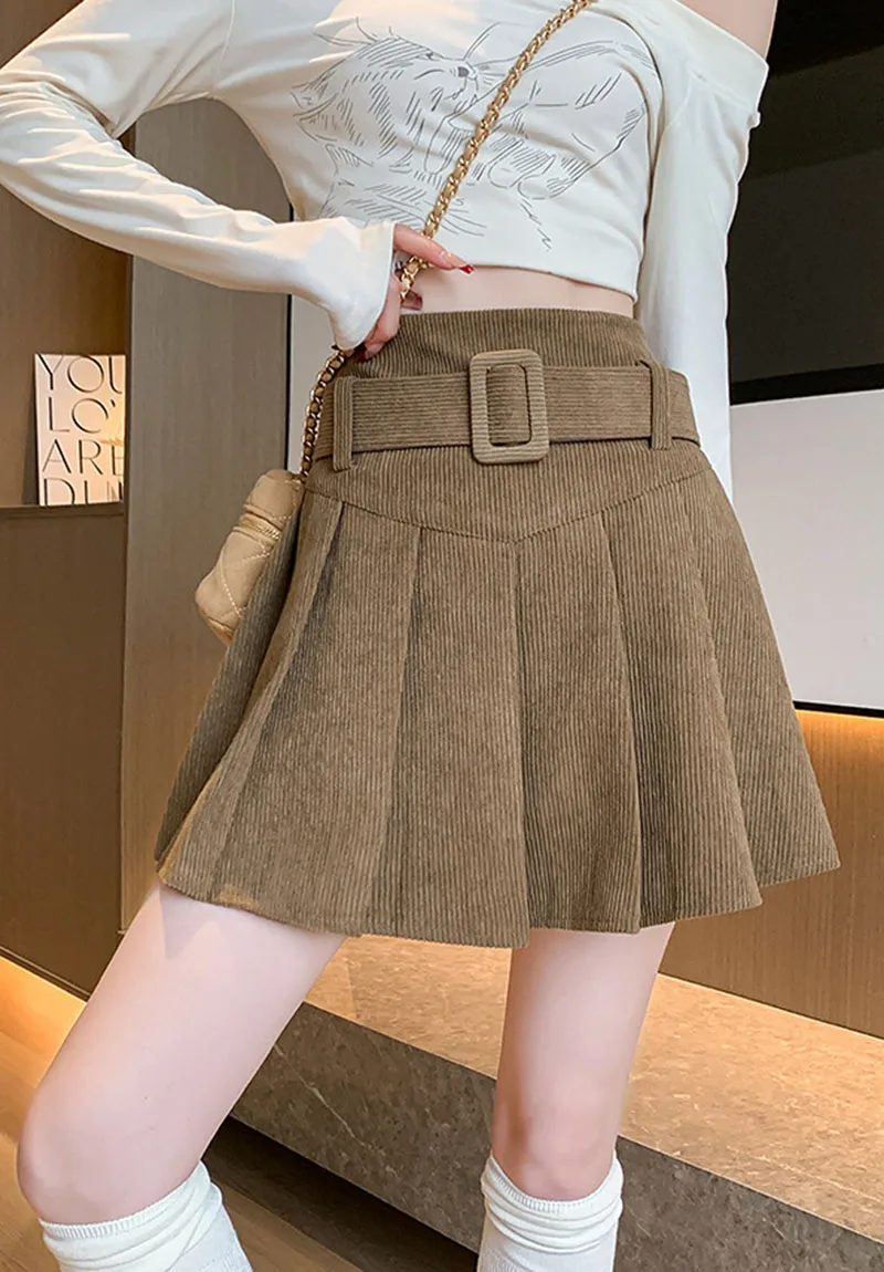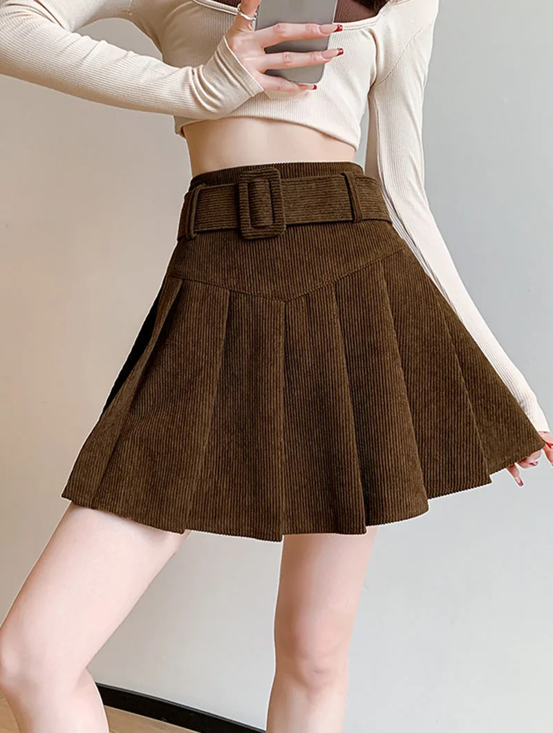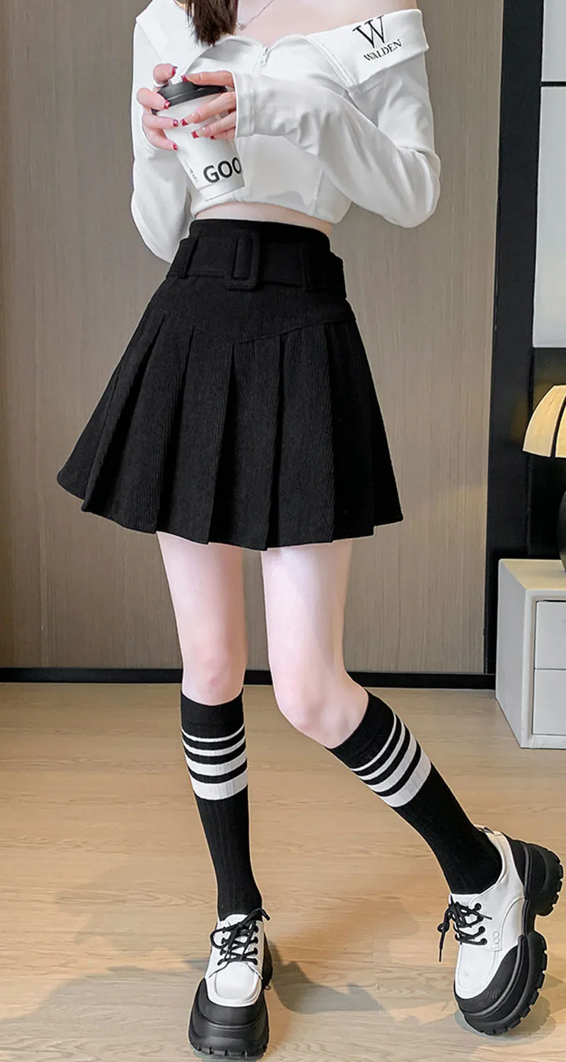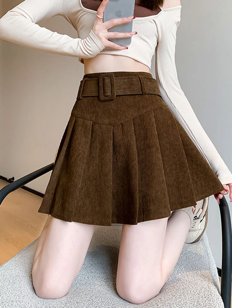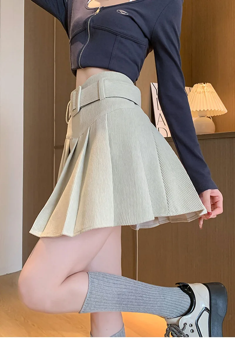 High Waist Pleated Skirt Woman Fashion with Belt A-Line Skirts