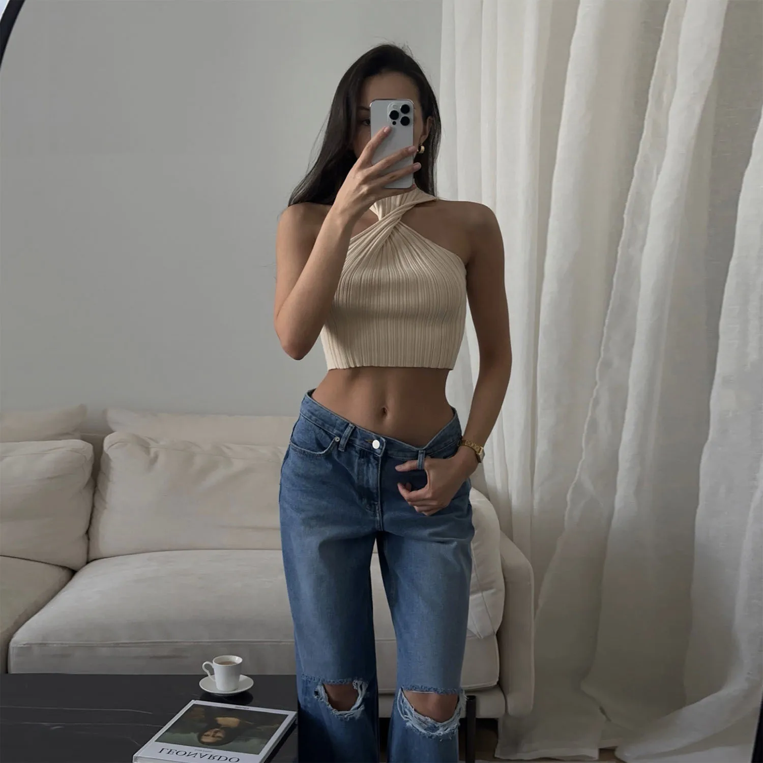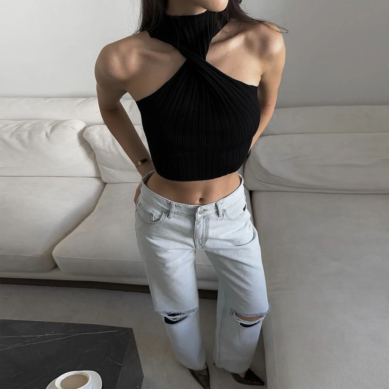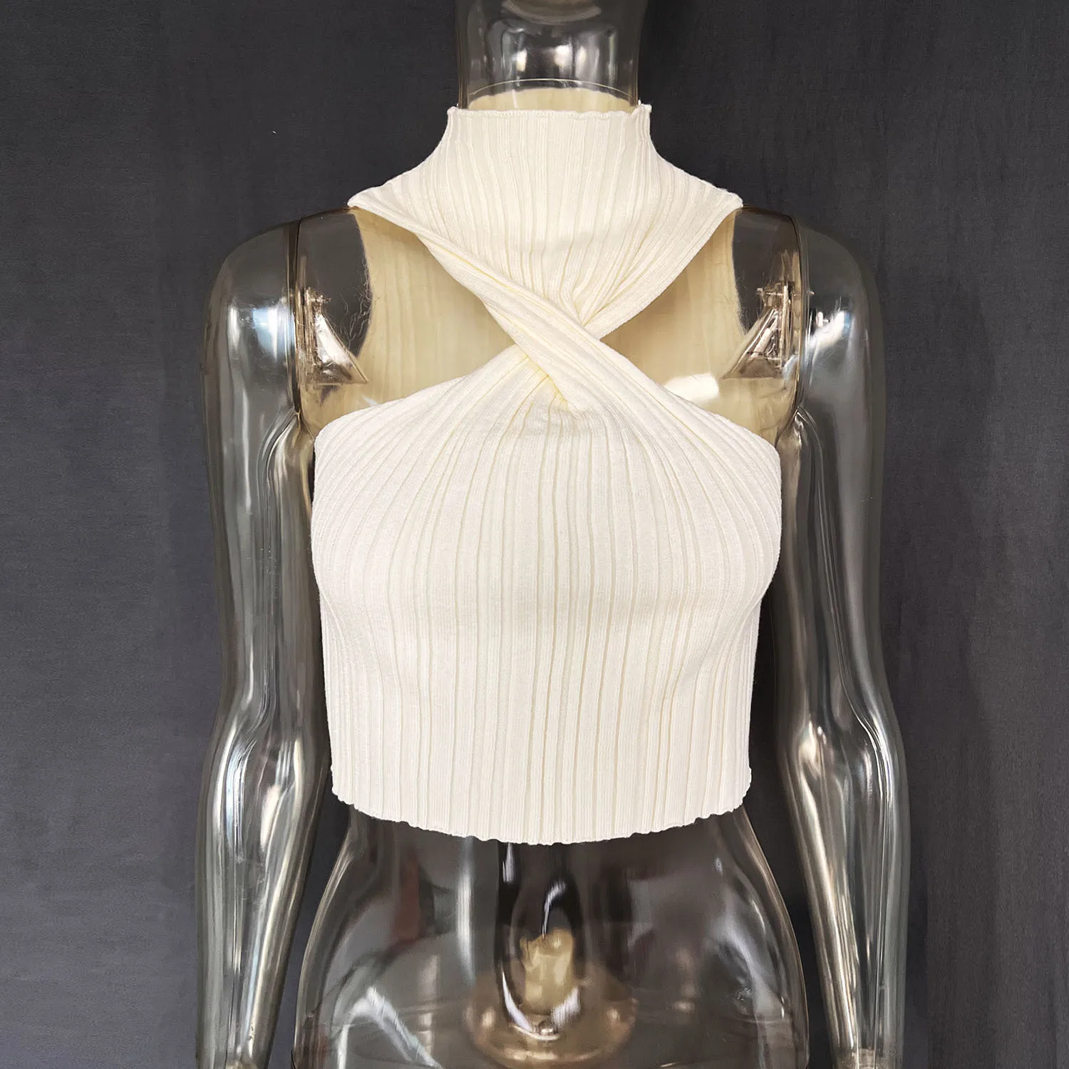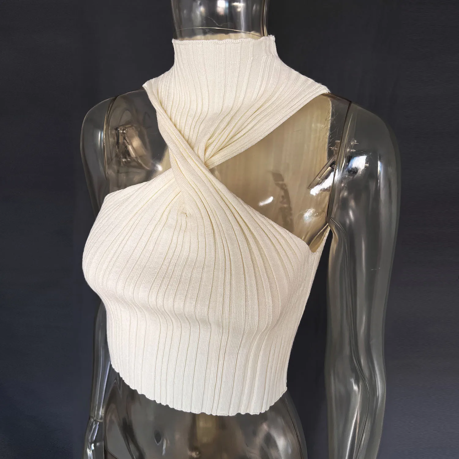 Knitted Sexy Twist Front Sleeveless Halter Crop Top